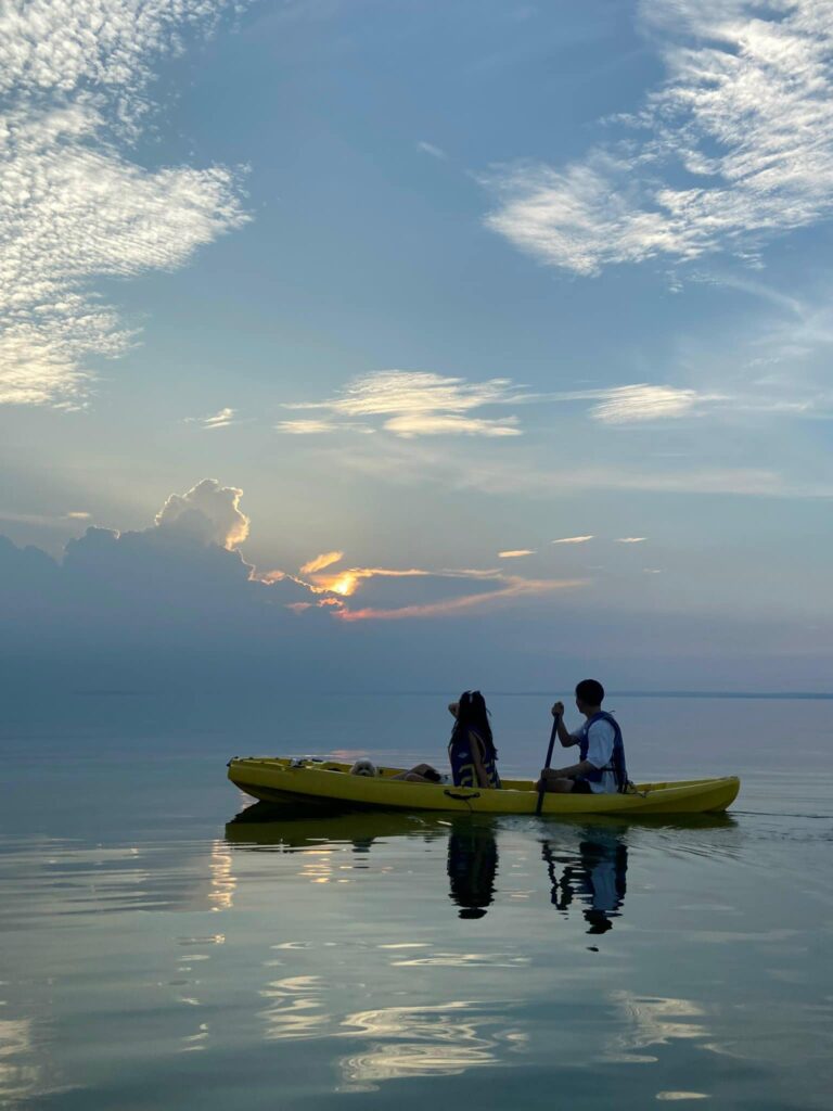 Một trong những điều đặc biệt nhất khi chèo SUP và kayak tại Làng là cảnh hoàng hôn. Mặt trời đỏ rực từ từ khuất dần sau rặng núi xa xa, soi bóng xuống làn nước trong trẻo. Ngồi trên thuyền hay đứng trên SUP, bạn sẽ cảm nhận rõ sự giao hòa tuyệt đẹp giữa con người và thiên nhiên.